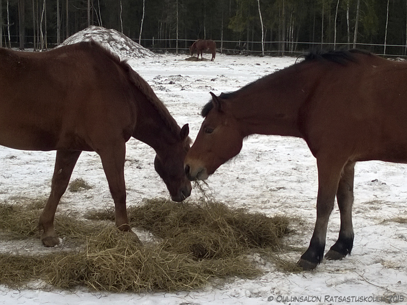 Aamuruuan jälkeen laittelin sitten hepat ulos ja sai siinä hieman taas ihmetellä hevosen ajatusmaailmaa: lähes jokainen otti ensi töikseen ulos päästyään oikein kunnon lumipesun pyörimällä piehtaroiden kyljeltä kyljelle. Pakkasta pihalla oli sillä hetkellä -19